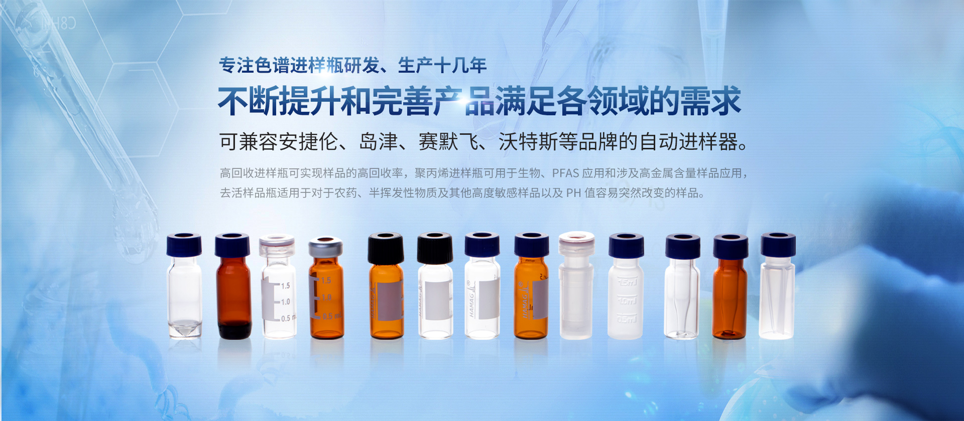 浙江哈邁科技有限公司(簡稱HAMAG),成立于2005年,總部位于美麗的海濱城市寧波,是中國優(yōu)質(zhì)色譜進(jìn)樣瓶、樣品瓶供應(yīng)商,是一家專業(yè)從事色譜耗材的科研、設(shè)計、生產(chǎn)、銷售和系統(tǒng)集成為一體的生產(chǎn)型企業(yè)。經(jīng)過十幾年的研發(fā)與努力,通過和國內(nèi)外多個科研部門,浙江大學(xué)理工學(xué)院,同時與品牌:安捷倫、沃特世、島津等公司的技術(shù)交流與學(xué)習(xí),我們成功的研制開發(fā)出實(shí)驗(yàn)室分析設(shè)備專用的各種型號的自動進(jìn)樣瓶、頂空瓶及其配套蓋墊;特氟龍與硅膠復(fù)合墊片;特氟龍/硅膠制品;創(chuàng)新型固相萃取儀;針式過濾器等幾十種實(shí)驗(yàn)室耗材及關(guān)聯(lián)產(chǎn)品...